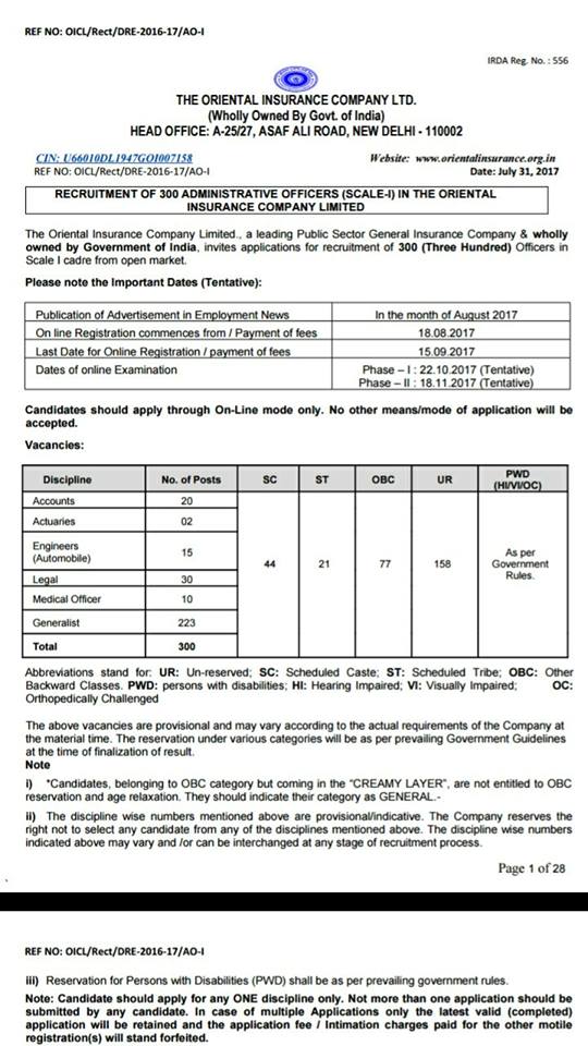 ORIENTAL INSURANCE COMPANY LIMITED NOTIFICATION